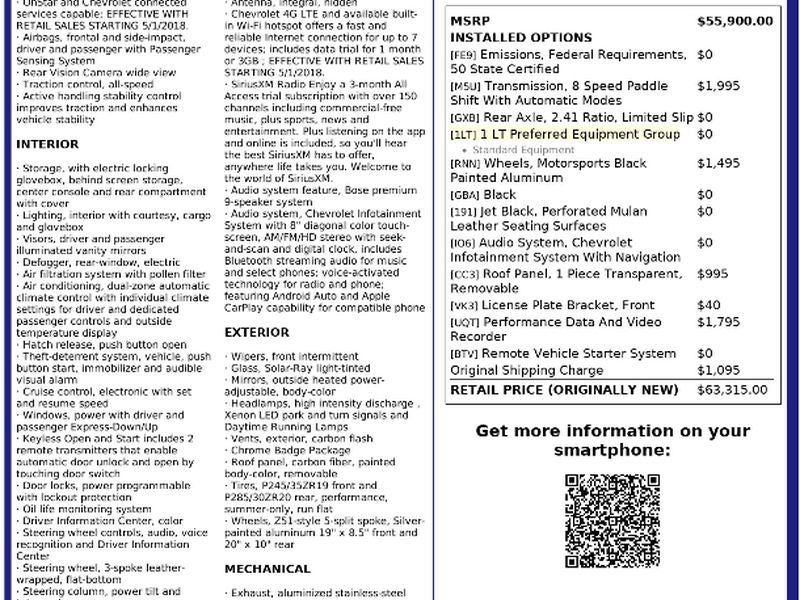 Preferred Equipment Group 1LT Performance Data and Video Recorder 19" X 8.5" Front and 20" X 10" Rear Motorsports Wheels 1-Piece Removable Transparent Roof Panel Front License Plate Bracket **Equipment listed is based on original vehicle build and subject to change. Please confirm the accuracy of the included equipment by calling the dealer prior to purchase.**