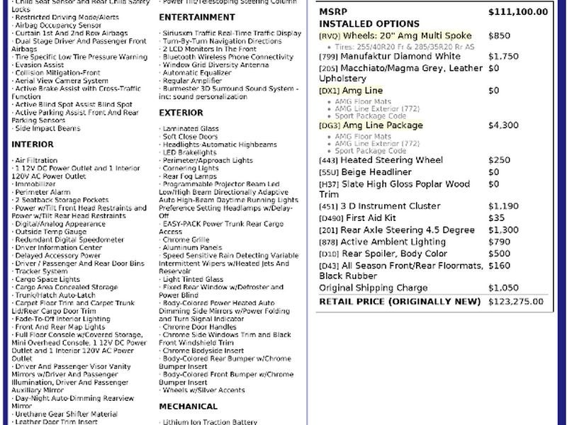 AMG Line Package: AMG Line Exterior; Sport Package Code; AMG Floor Mats MANUFAKTUR Diamond White 4.5 Degree Rear Axle Steering 20" AMG Multi Spoke Wheels Rear Deck Spoiler in Body Color Heated Steering Wheel Black Rubber All-Season Front and Rear Floor Mats **Equipment listed is based on original vehicle build and subject to change. Please confirm the accuracy of the included equipment by calling the dealer prior to purchase.**