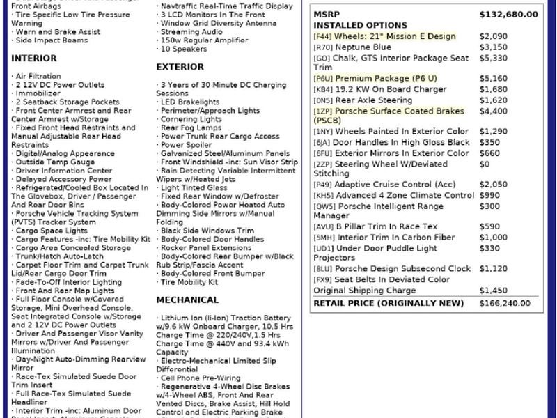 Premium Package: Ionizer; Surround View; Fixed Panoramic Roof in Glass; Power Folding Exterior Mirrors; Thermally and Noise Insulated Glass; Lane Change Assist (LCA); Storage Package; BOSE Surround Sound System Technology Package: Passenger Display; Adaptive Cruise Control (ACC); Head-Up Display; Remote ParkAssist with Lane Change Assist Paint to Sample Porsche Ceramic Composite Brake (PCCB) Porsche Ceramic Composite Brakes (PCCB) in Yellow Burmester 3D High-End Surround Sound System Deviated Stitching Interior Package and Leather Seat Centers 21" Taycan Exclusive Design Wheels with Carbon Fiber Blades GTS Interior Package Seat Trim Deviated Stitching Interior Package Panoramic Roof with Variable Light Control Porsche Surface Coated Brakes (PSCB) SportDesign Package in Carbon Fiber GTS Deviated Stitching Interior Package Porsche InnoDrive with Adaptive Cruise Control (ACC) and Active Lane Keep (ALK) Porsche Dynamic Chassis Control Sport (PDCC Sport) Illuminated Bespoke Matte Carbon Fiber Door Sill Guards Porsche Surface Coated Brakes (PSCB) with White Calipers Neptune Blue Carmine Red Chalk Ice Grey Metallic Olea Club Leather Seat Trim with Two-Tone Interior Illuminated Bespoke Door Sill Guards 21" RS Spyder Design Wheels Remote ParkAssist with Lane Change Assist Inner Door-Sill Guards and B-Pillars in Leather Olea Club Leather Seat Trim Night Vision Assist Wheels: 21" Taycan Exclusive Design 21" Mission E Design Wheels Deviated Leather Seat Centers Adaptive Cruise Control (ACC) Front Massage Seat Function with Seat Ventilation Head-Up Display Exterior Mirror Upper Trim in Carbon Fiber Rear Axle Steering Porsche Rear Seat Entertainment (PRSE) Front Seat Consoles in Leather Center Console Trim in Leather Front Seat Consoles in Race-Tex Center Console Trim in Race-Tex Fixed Panoramic Roof in Glass Bespoke Floor Mats with Leather Edging Illuminated Door-Sill Guards in Matte Carbon Fiber Wheels Painted in Satin Aurum Wheels Painted in Satin Platinum Wheels Painted in High Gloss Black Wheels Painted in Jet Black Metallic Wheels Painted in Exterior Color Illuminated Door-Sill Guards in Carbon Fiber Surround View BOSE Surround Sound System Bespoke Decal Set Thermally and Noise Insulated Glass Passenger Display Porsche Design Subsecond Clock Door Trim Package in Leather Interior Accents in Exterior Color Interior Trim in Carbon Fiber Advanced 4-Zone Climate Control Lane Change Assist (LCA) Illuminated Door-Sill Guards in Black Brushed Aluminum Deep-Pile Floor Mats with Leather Edging Deep-Pile Floor Mats with Race-Tex Edging Brake Calipers in High Gloss Black Illuminated Door-Sill Guards in Black Brushed Aluminum Front Seat Ventilation Dashboard End Trims in Leather Sun Visors in Leather Carrara White Metallic Jet Black Metallic Volcano Grey Metallic Cherry Metallic Dolomite Silver Metallic Frozen Berry Metallic Coffee Beige Metallic Gentian Blue Metallic Frozen Blue Metallic Mamba Green Metallic Mahogany Metallic Rear Seat Storage Tray in Leather Rear Tunnel Storage Tray in Leather Personalized Floor Mats with Leather Edging Floor Mats with Race-Tex Edging Porsche Experience Center Delivery (Los Angeles) Heated Race-Tex Steering Wheel with Carbon Fiber Trim Heated GT Sport Steering Wheel with Carbon Fiber Trim Heated Race-Tex Steering Wheel with Carbon Fiber Trim Exterior Mirror Lower Trim in Exterior Color Exterior Mirrors in Exterior Color Seat Belts in Bordeaux Red Seat Belts in Chalk Seat Selts in Blackberry Seat Belts in Limestone Beige Seat Belts in Meranti Brown Seat Belts in Atacama Beige Seat Belts in Slate Grey Seat Belts in Truffle Brown Seat Belts in Graphite Blue Interior Accents in Neodyme Interior Accents in Dark Silver Porsche Experience Center Delivery (Atlanta) Power Charge Port Cover Wheels: 20" Taycan Turbo Aero Wheels: 20" Sport Aero Vehicle Key in Leather with 1 Key Pouch in Leather Bespoke Reversible Loadspace Mat with Leather Edging B-Pillar Trim in Race-Tex Leather Seat Trim with Two-Tone Leather Interior Race-Tex Seat Trim with Two-Tone Interior Porsche Crest on Front and Rear Headrests Interior Trim in Paldao Rear Heated Seats Rear 2+1 Seats Owner's Manual Wallet in Leather Vehicle Keys Painted with 1 Key Pouch in Leather Center Console Armrest with Porsche Crest Center Console Armrest with Model Designation Center Console Armrest with Porsche Logo Interior Mirror Panel in Race-Tex Sport Chrono Stopwatch Dial in White Sport Chrono Stopwatch Dial in Bordeaux Red Preparation For Rear Seat Entertainment (prse) Pedals and Footrest in Aluminum Door Handles in High Gloss Black Ionizer Power Folding Exterior Mirrors Under Door Puddle Light Projectors Personalized Reversible Loadspace Mat with Leather Edging Reversible Luggage Compartment Mat with Race-Tex Edging Model Designation on Rear in Exterior Color Porsche Intelligent Range Manager Storage Package Model Designation on Rear in High Gloss Black Ski Bag Fire Extinguisher Locking Wheel Bolts **Equipment listed is based on original vehicle build and subject to change. Please confirm the accuracy of the included equipment by calling the dealer prior to purchase.**