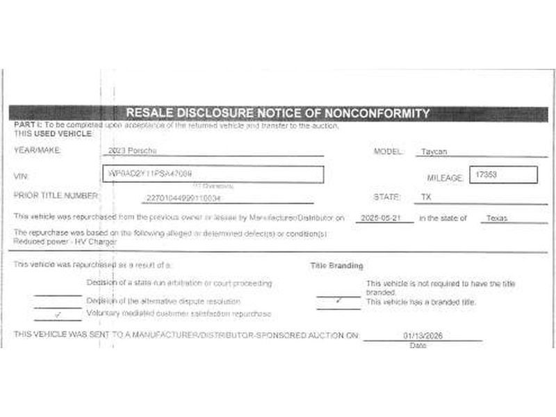 This 2023 Porsche Taycan has auto-adjust speed for safe following. The Porsche Taycan offers Android Auto for seamless smartphone integration. Apple CarPlay: Seamless smartphone integration for this model - stay connected and entertained on the go! The high efficiency automatic transmission shifts smoothly and allows you to relax while driving. Engulf yourself with the crystal clear sound of a BOSE sound system in it. See what's behind you with the back up camera on the Porsche Taycan. Impresses the most discerning driver with the deep polished blue exterior on the Porsche Taycan. Maintaining a stable interior temperature in this 2023 Porsche Taycan is easy with the climate control system. This 2023 Porsche Taycan features cruise control for long trips. The Electronic Stability Control will keep you on your intended path. It has a Electric Motor high output engine. This vehicle features a hands-free Bluetooth® phone system. Heated seats for those cold winter days are included in this unit. This unit is pure luxury with a heated steering wheel. Lane Keep Assist in this vehicle helps maintain safe driving by gently steering to stay within the lane. This is one of the largest cars available. The leather seats are soft and supportive on it. With the adjustable lumbar support in this 2023 Porsche Taycan your back will love you. You'll never again be lost in a crowded city or a country region with the navigation system on this vehicle. The rear bucket seats in this 2023 Porsche Taycan will give your passengers a comfortable and spacious ride. The rear heated seats in this Porsche Taycan makes for happy winter passengers. This large car is rear wheel drive.